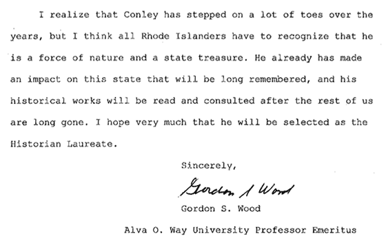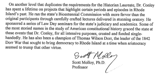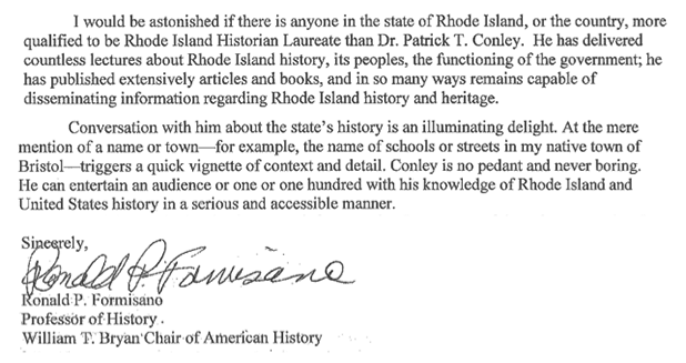 Patrick Conley’s interest in becoming the first Historian Laureate of Rhode Island prompted him to solicit letters of recommendation addressed to the Secretary of State (the appointing authority) relative to his qualifications and suitability for that newly-created post.